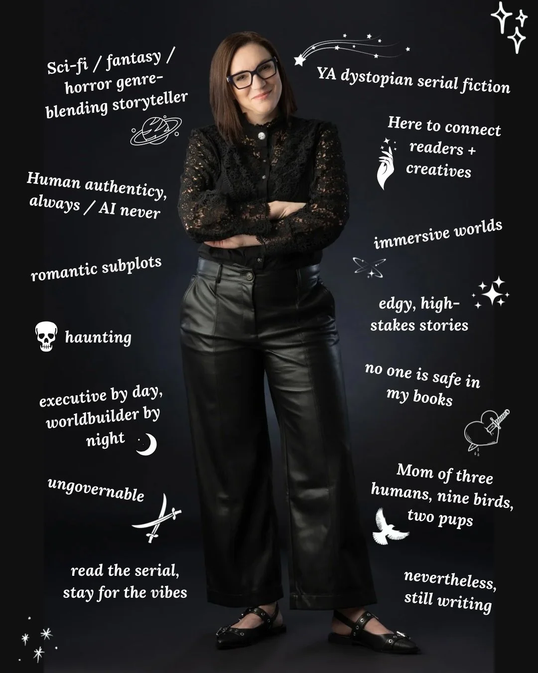 About me, the short version: I’m glad you’ve found me. I write young and new adult fantasy, science fiction, horror, and stories strange and dark. I believe all good stories grow from a kernel of truth, and there has to be romantic love and high stakes for me to stay invested. (Some murder and daring adventure helps, too!) When I’m not writing, you can find me listening to audiobooks. playing video games with my three kids and husband, or hanging out with my nine pet birds. If you’d like updates on my writing journey, please consider following me on Instagram and subscribing to my free newsletter. To learn even more about me, check out my about me page.